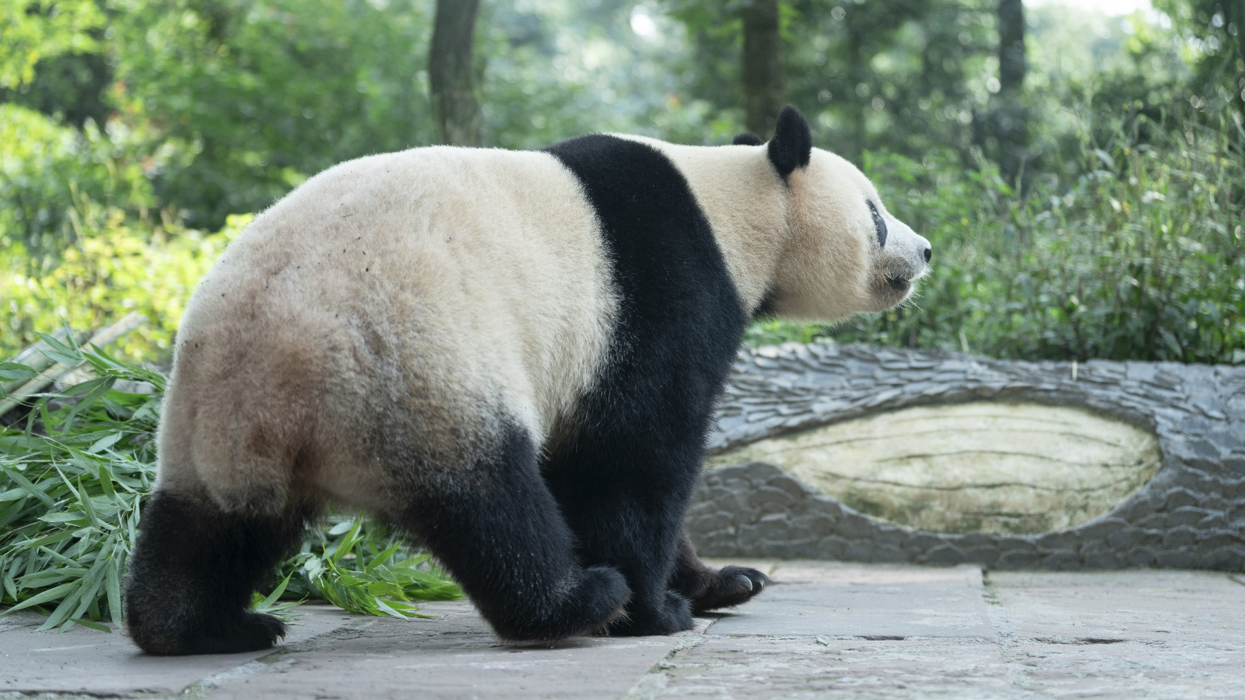 This image, captured by Panda365 on August 20, 2025, at the Bifengxia Base in Ya’an, Sichuan, features Xiang Xiang. The Japanese-born panda is seen from the side, her back to the camera, in a standing posture. (XiangXiang)