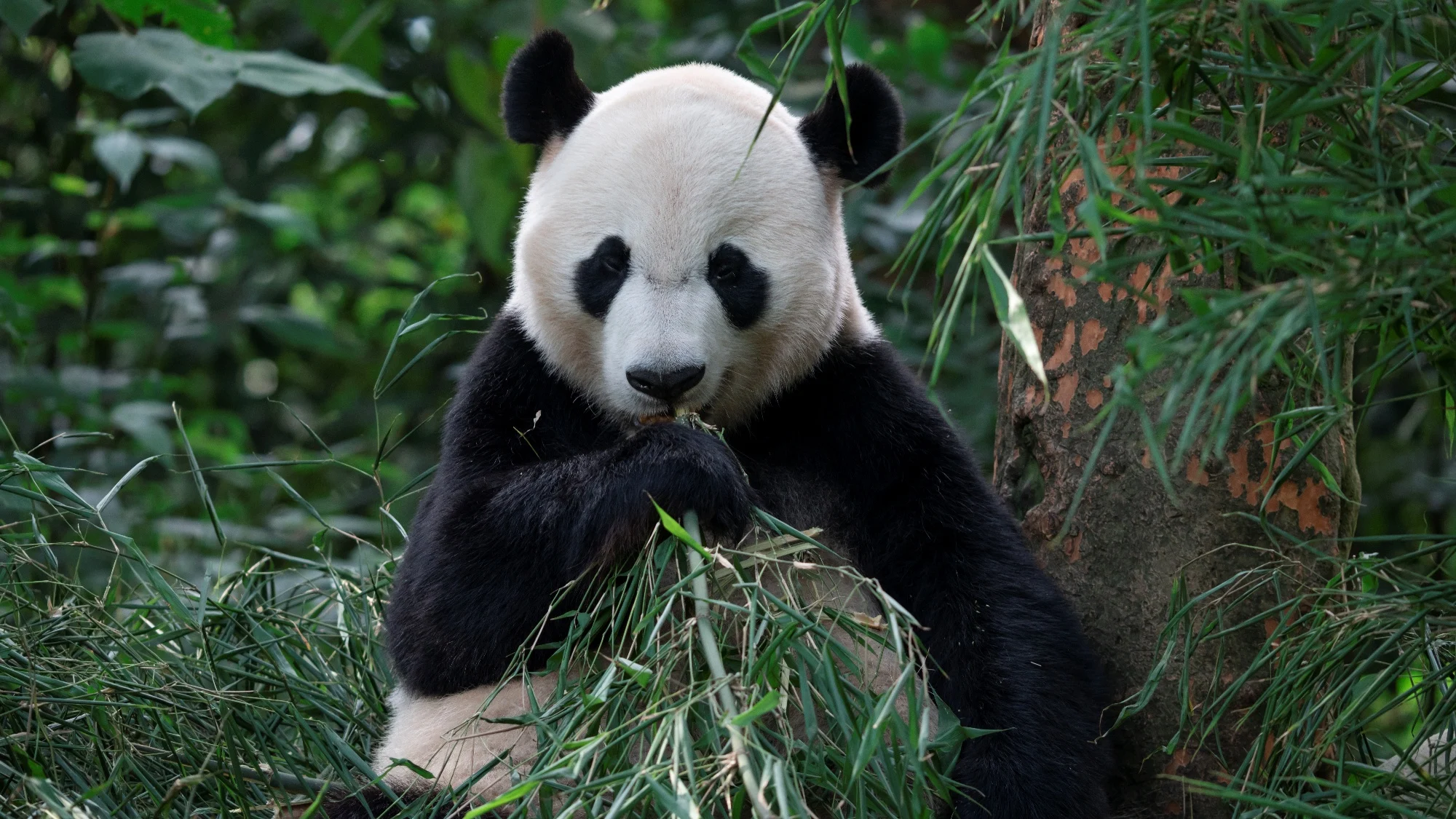 The photo shows Bei Bei immersed in enjoying bamboo leaves on September 23, 2024.