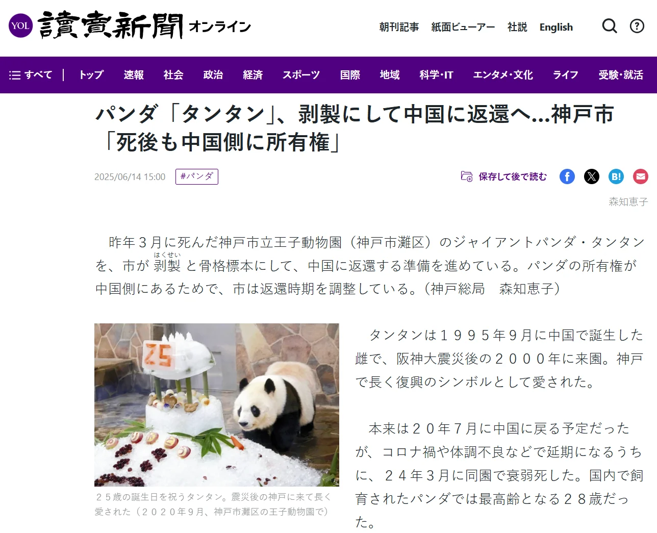 According to a report by Japan’s Yomiuri Shimbun on June 14, 2025, Dan Dan, the giant panda that died in March last year at Kobe City’s Prince Zoo (Nada Ward, Kobe), is currently being prepared as a specimen by the city of Kobe, with plans to return it to China. This is because the ownership of the giant panda belongs to the Chinese side, and both parties are coordinating the timing of the return. (DanDan)