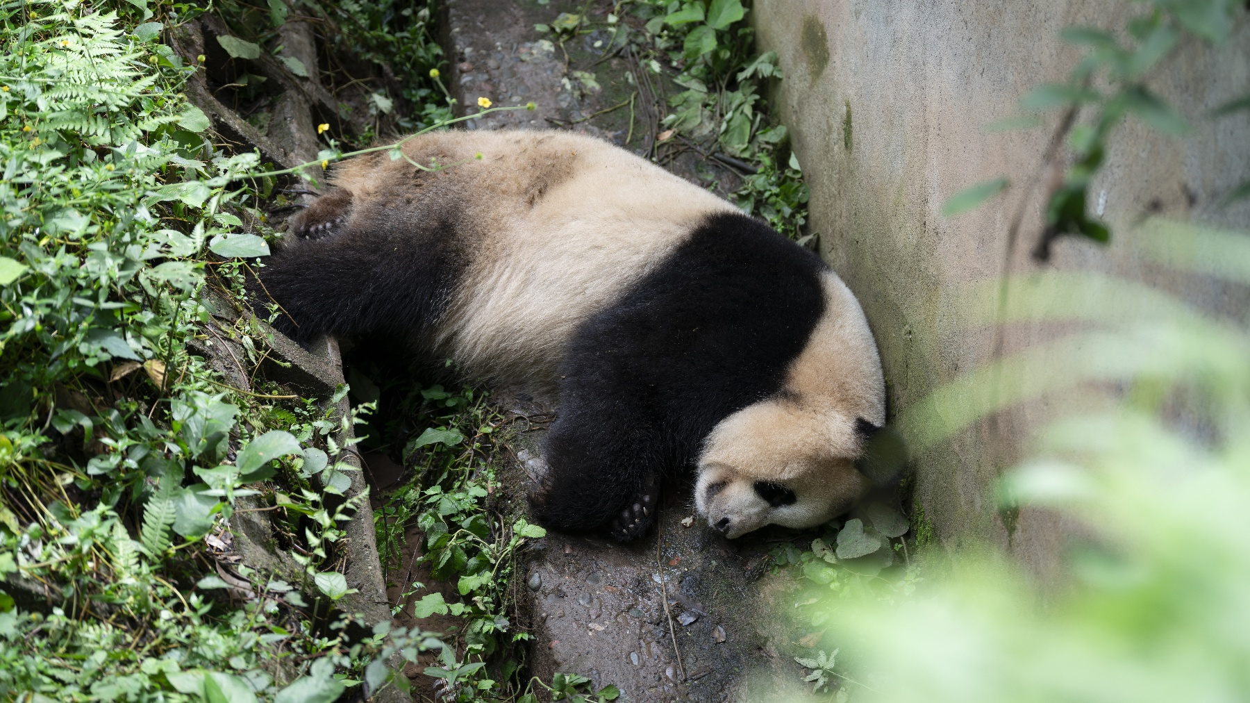 This photo was taken by Panda365 on August 25, 2025, at the Bifengxia Base of the China Conservation and Research Center for the Giant Panda in Ya’an, Sichuan. It shows Fan Xing, a giant panda who returned from the Netherlands, sleeping by the wall. (FanXing)