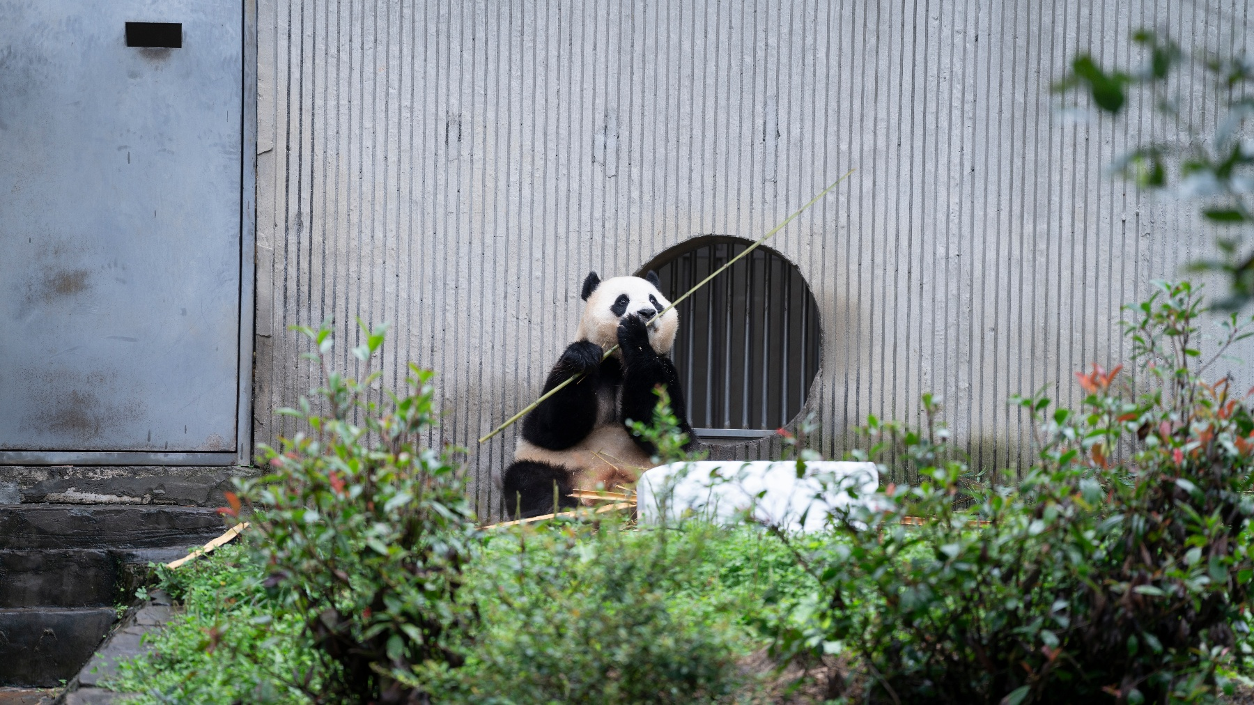 This photo, taken by Panda365 on September 12, 2025, shows Fu Bao, a giant panda returned from South Korea, eating bamboo in front of her den at the Shenshuping Base of the China Conservation and Research Center for the Giant Panda in Wolong, Sichuan. (FuBao)