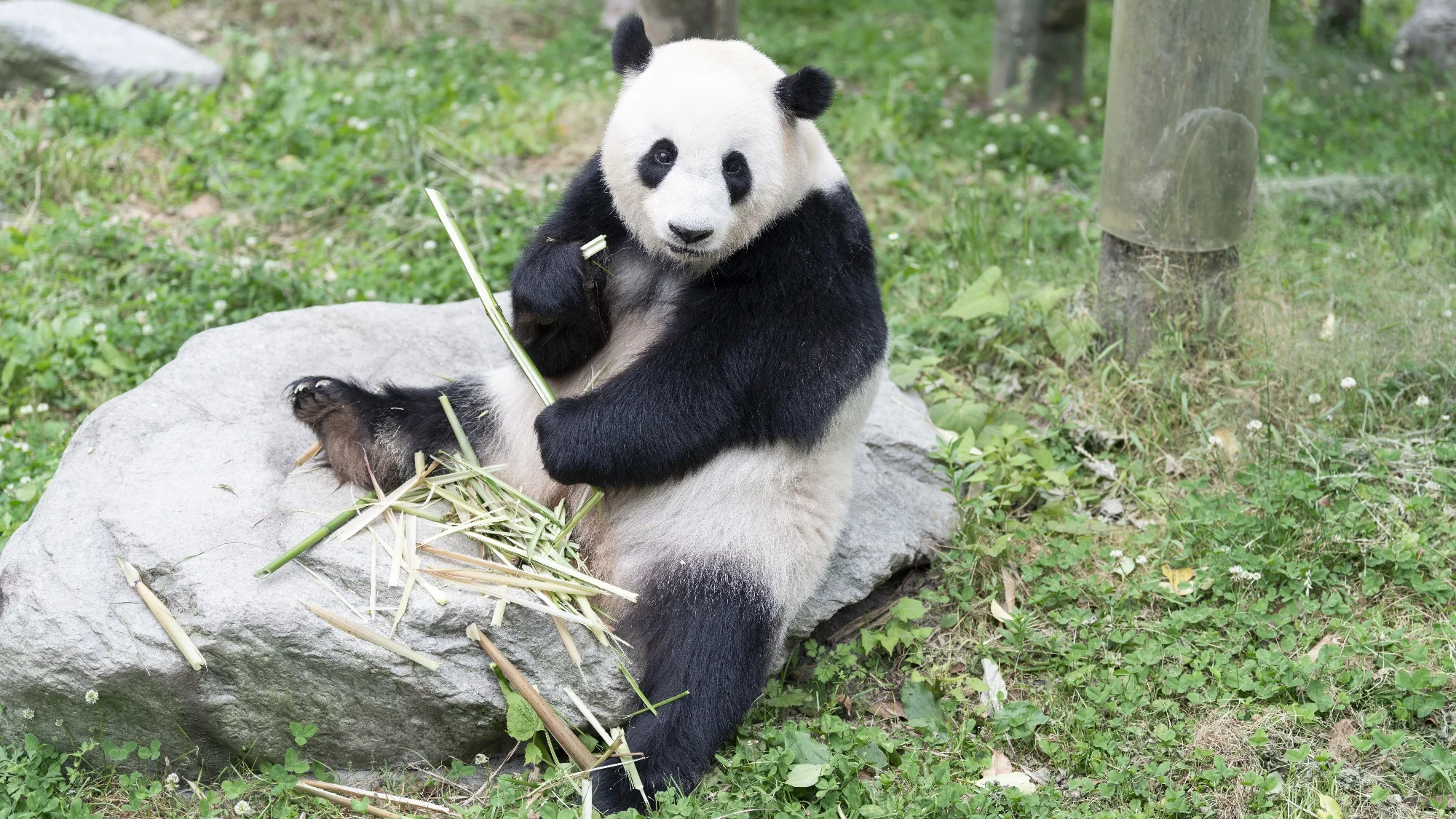 This photo was taken by Panda365 on June 18, 2025, at the Sichuan Wolong Shenshuping Base of the China Giant Panda Protection and Research Center. It shows the Malaysian-born giant panda Yi Yi happily eating bamboo on a large rock. (YiYi)