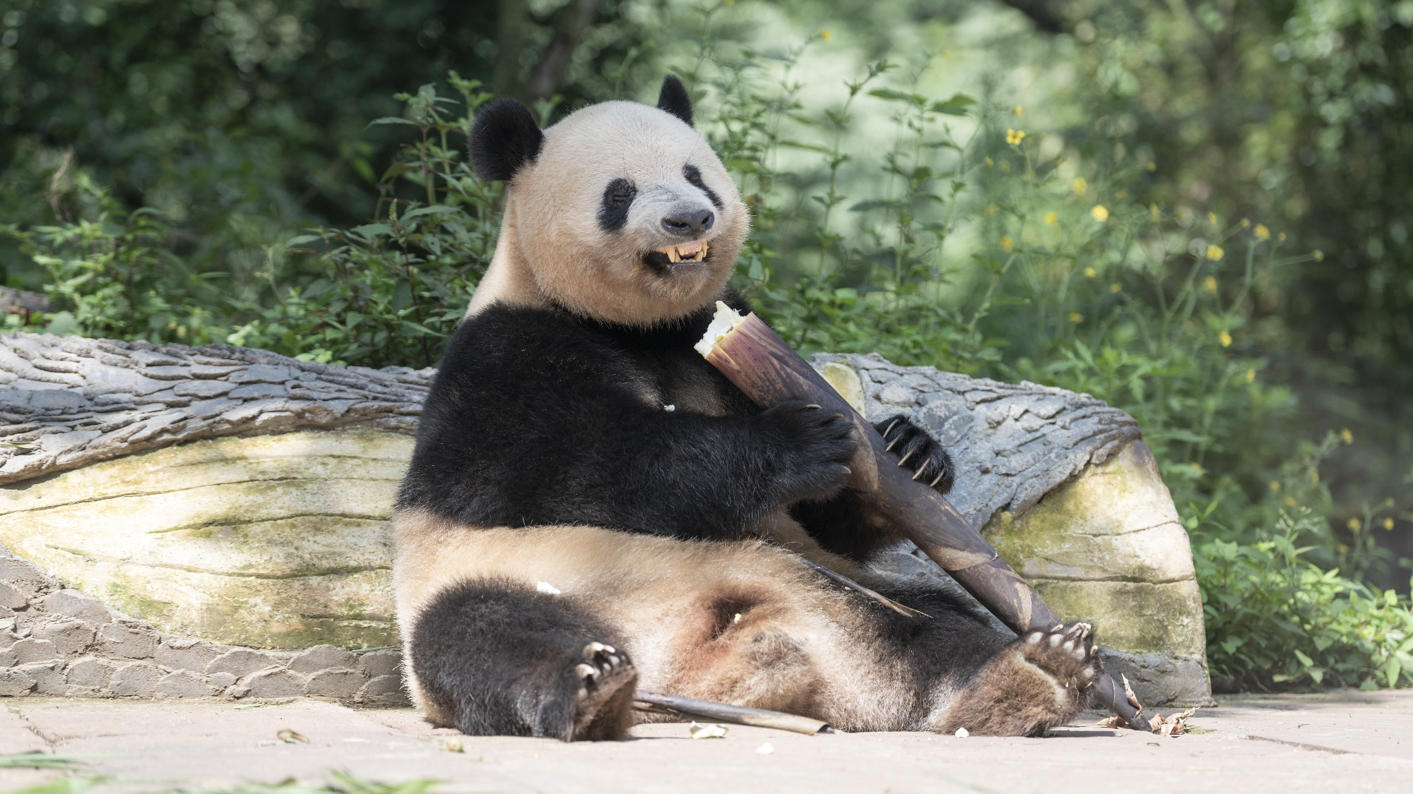 This photo was taken by Panda365 on July 19, 2025, at the China Giant Panda Protection and Research Center’s Bifengxia Base in Ya’an, Sichuan. The Japan-born giant panda Xiang Xiang is sitting in front of a tree stump, eating bamboo shoots with a wide, smiling mouth. (XiangXiang)