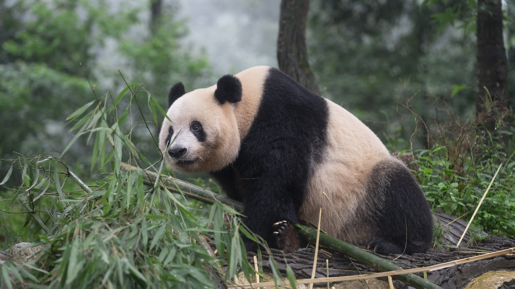 This photo was taken by Panda365 on August 9, 2025, at the Bifengxia Base of the China Conservation and Research Center for the Giant Panda in Ya’an, Sichuan, China. It shows Xiang Xiang, a giant panda returned from Japan, sniffing bamboo on a tree stump. (XiangXiang)