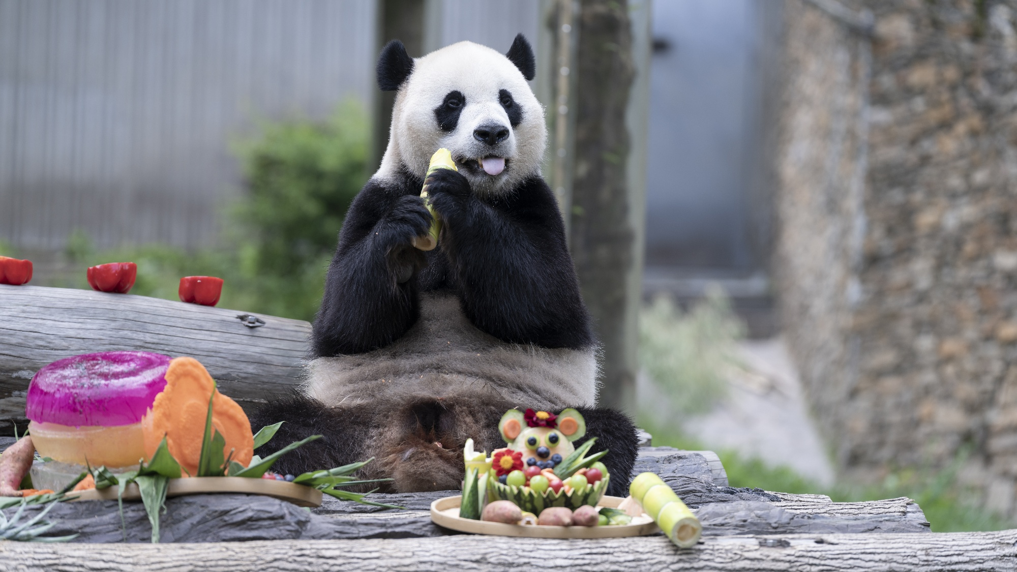 The period from July to September 2025 is the “2025 Panda Center Giant Panda Birthday Season” enrichment activity at the China Giant Panda Conservation Center. This photo was taken by Panda356 on July 17, 2025, at the Woshenshuping Base of the Sichuan China Giant Panda Conservation Center. The American-born giant panda Xiao Qi Ji is eating enrichment food on a wooden frame. (XiaoQiJi)